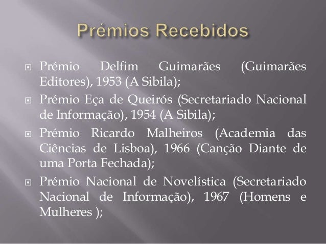 4. 4.  Prémio Delfim Guimarães (Guimarães Editores), 1953 (A Sibila); Prémio Eça de Queirós (Secretariado Nacional de Informação), 1954 (A Sibila); Prémio Ricardo Malheiros (Academia das Ciências de Lisboa), 1966 (Canção Diante de uma Porta Fechada); Prémio Nacional de Novelística (Secretariado Nacional de Informação), 1967 (Homens e Mulheres );