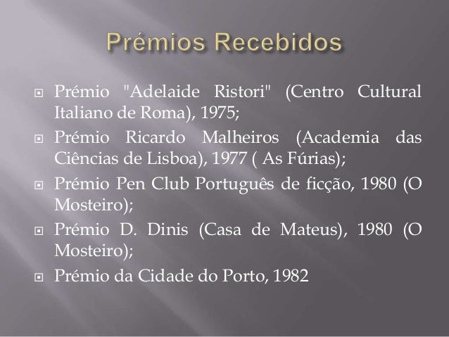 5. 5.  Prémio "Adelaide Ristori" (Centro Cultural Italiano de Roma), 1975; Prémio Ricardo Malheiros (Academia das Ciências de Lisboa), 1977 ( As Fúrias); Prémio Pen Club Português de ficção, 1980 (O Mosteiro); Prémio D. Dinis (Casa de Mateus), 1980 (O Mosteiro); Prémio da Cidade do Porto, 1982