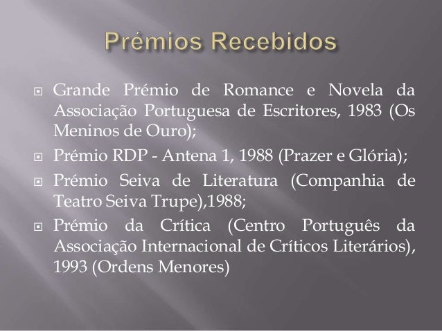 6. 6.  Grande Prémio de Romance e Novela da Associação Portuguesa de Escritores, 1983 (Os Meninos de Ouro); Prémio RDP - Antena 1, 1988 (Prazer e Glória); Prémio Seiva de Literatura (Companhia de Teatro Seiva Trupe),1988; Prémio da Crítica (Centro Português da Associação Internacional de Críticos Literários), 1993 (Ordens Menores)