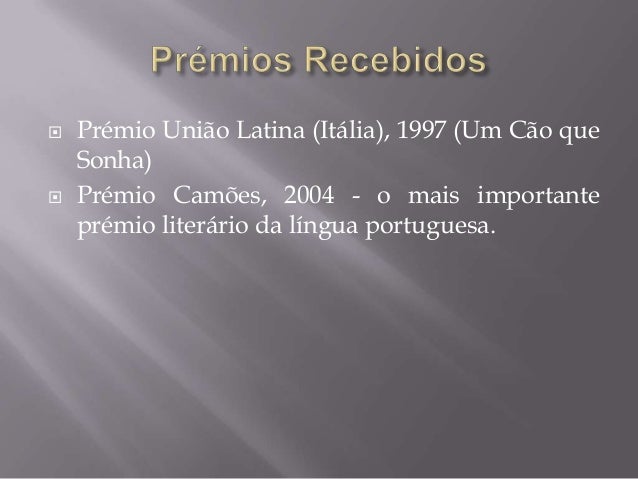 7. 7.  Prémio União Latina (Itália), 1997 (Um Cão que Sonha) Prémio Camões, 2004 - o mais importante prémio literário da língua portuguesa.