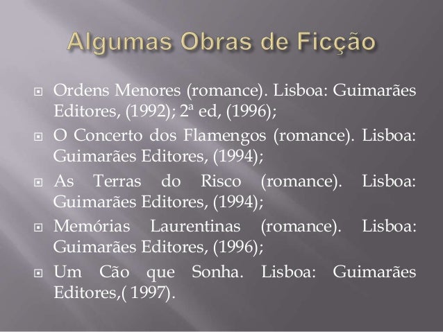 8. 8.  Ordens Menores (romance). Lisboa: Guimarães Editores, (1992); 2ª ed, (1996); O Concerto dos Flamengos (romance). Lisboa: Guimarães Editores, (1994); As Terras do Risco (romance). Lisboa: Guimarães Editores, (1994); Memórias Laurentinas (romance). Lisboa: Guimarães Editores, (1996); Um Cão que Sonha. Lisboa: Guimarães Editores,( 1997).