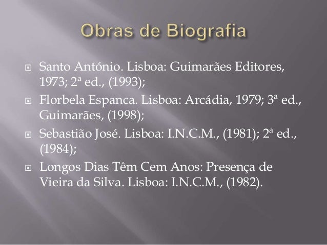9. 9.  Santo António. Lisboa: Guimarães Editores, 1973; 2ª ed., (1993); Florbela Espanca. Lisboa: Arcádia, 1979; 3ª ed., Guimarães, (1998); Sebastião José. Lisboa: I.N.C.M., (1981); 2ª ed., (1984); Longos Dias Têm Cem Anos: Presença de Vieira da Silva. Lisboa: I.N.C.M., (1982).