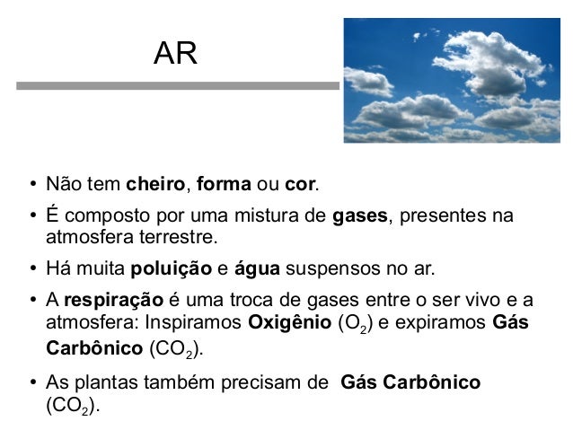 3. 3. AR ● ● ● ● ● Não tem cheiro, forma ou cor. É composto por uma mistura de gases, presentes na atmosfera terrestre. Há muita poluição e água suspensos no ar. A respiração é uma troca de gases entre o ser vivo e a atmosfera: Inspiramos Oxigênio (O2) e expiramos Gás Carbônico (CO2). As plantas também precisam de Gás Carbônico (CO2).