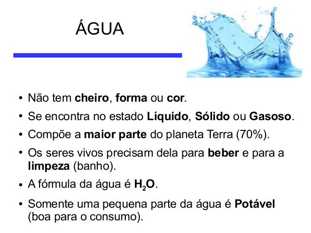 4. 4. ÁGUA ● Não tem cheiro, forma ou cor. ● Se encontra no estado Líquido, Sólido ou Gasoso. ● Compõe a maior parte do planeta Terra (70%). ● ● ● Os seres vivos precisam dela para beber e para a limpeza (banho). A fórmula da água é H2O. Somente uma pequena parte da água é Potável (boa para o consumo).