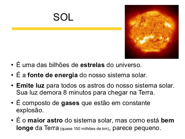 5. 5. SOL / ● É uma das bilhões de estrelas do universo. ● É a fonte de energia do nosso sistema solar. ● ● ● Emite luz para todos os astros do nosso sistema solar. Sua luz demora 8 minutos para chegar na Terra. É composto de gases que estão em constante explosão. É o maior astro do sistema solar, mas como está bem longe da Terra (quase 150 milhões de km), parece pequeno.