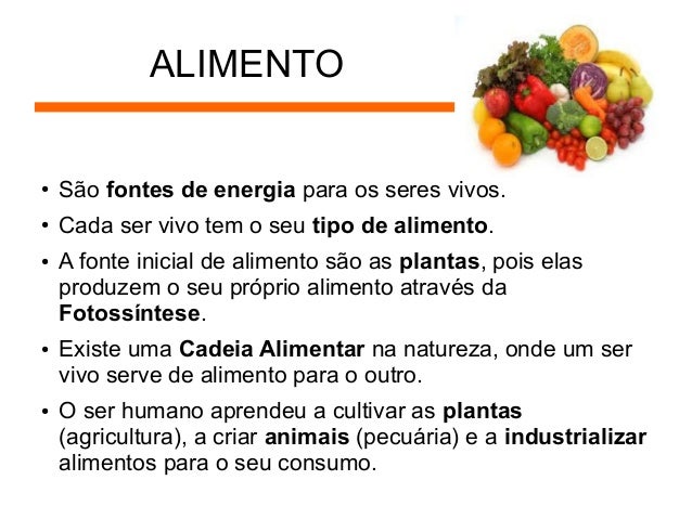 6. 6. ALIMENTO ● São fontes de energia para os seres vivos. ● Cada ser vivo tem o seu tipo de alimento. ● ● ● A fonte inicial de alimento são as plantas, pois elas produzem o seu próprio alimento através da Fotossíntese. Existe uma Cadeia Alimentar na natureza, onde um ser vivo serve de alimento para o outro. O ser humano aprendeu a cultivar as plantas (agricultura), a criar animais (pecuária) e a industrializar alimentos para o seu consumo.