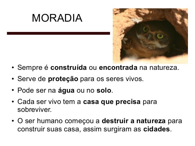 7. 7. MORADIA ● Sempre é construída ou encontrada na natureza. ● Serve de proteção para os seres vivos. ● Pode ser na água ou no solo. ● ● Cada ser vivo tem a casa que precisa para sobreviver. O ser humano começou a destruir a natureza para construir suas casa, assim surgiram as cidades.