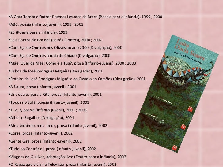 11. 11. <ul><li>A Gata Tareca e Outros Poemas Levados da Breca (Poesia para a infância), 1999 ; 2000 </li></ul><ul><li>ABC, poesia (Infanto-juvenil), 1999 ; 2001 </li></ul><ul><li>25 (Poesia para a infância), 1999 </li></ul><ul><li>Seis Contos de Eça de Queirós (Contos), 2000 ; 2002 </li></ul><ul><li>Com Eça de Queirós nos Olivais no ano 2000 (Divulgação), 2000 </li></ul><ul><li>Com Eça de Queirós à roda do Chiado (Divulgação), 2000 </li></ul><ul><li>Mãe, Querida Mãe! Como é a Tua?, prosa (Infanto-juvenil), 2000 ; 2003 </li></ul><ul><li>Lisboa de José Rodrigues Miguéis (Divulgação), 2001 </li></ul><ul><li>Roteiro de José Rodrigues Miguéis: do Castelo ao Camões (Divulgação), 2001 </li></ul><ul><li>A flauta, prosa (Infanto-juvenil), 2001 </li></ul><ul><li>Uns óculos para a Rita, prosa (Infanto-juvenil), 2001 </li></ul><ul><li>Todos no Sofá, poesia (Infanto-juvenil), 2001 </li></ul><ul><li>1, 2, 3, poesia (Infanto-juvenil), 2001 ; 2003 </li></ul><ul><li>Alhos e Bugalhos (Divulgação), 2001 </li></ul><ul><li>Meu bichinho, meu amor, prosa (Infanto-juvenil), 2002 </li></ul><ul><li>Cores, prosa (Infanto-juvenil), 2002 </li></ul><ul><li>Gente Gira, prosa (Infanto-juvenil), 2002 </li></ul><ul><li>Tudo ao Contrário!, prosa (Infanto-juvenil), 2002 </li></ul><ul><li>Viagens de Gulliver, adaptação livre (Teatro para a infância), 2002 </li></ul><ul><li>O Rapaz que vivia na Televisão, prosa (Infanto-juvenil), 2002 </li></ul>