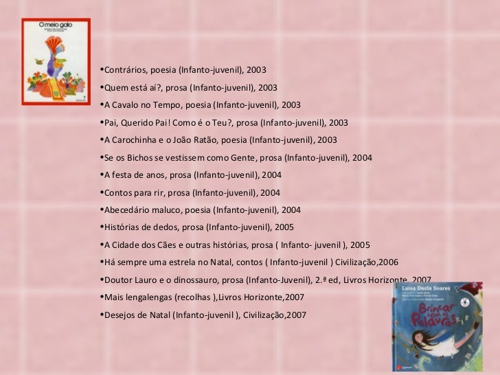12. 12. <ul><li>Contrários, poesia (Infanto-juvenil), 2003 </li></ul><ul><li>Quem está aí?, prosa (Infanto-juvenil), 2003 </li></ul><ul><li>A Cavalo no Tempo, poesia (Infanto-juvenil), 2003 </li></ul><ul><li>Pai, Querido Pai! Como é o Teu?, prosa (Infanto-juvenil), 2003 </li></ul><ul><li>A Carochinha e o João Ratão, poesia (Infanto-juvenil), 2003 </li></ul><ul><li>Se os Bichos se vestissem como Gente, prosa (Infanto-juvenil), 2004 </li></ul><ul><li>A festa de anos, prosa (Infanto-juvenil), 2004 </li></ul><ul><li>Contos para rir, prosa (Infanto-juvenil), 2004 </li></ul><ul><li>Abecedário maluco, poesia (Infanto-juvenil), 2004 </li></ul><ul><li>Histórias de dedos, prosa (Infanto-juvenil), 2005 </li></ul><ul><li>A Cidade dos Cães e outras histórias, prosa ( Infanto- juvenil ), 2005 </li></ul><ul><li>Há sempre uma estrela no Natal, contos ( Infanto-juvenil ) Civilização,2006 </li></ul><ul><li>Doutor Lauro e o dinossauro, prosa (Infanto-Juvenil), 2.ª ed, Livros Horizonte, 2007 </li></ul><ul><li>Mais lengalengas (recolhas ),Livros Horizonte,2007 </li></ul><ul><li>Desejos de Natal (Infanto-juvenil ), Civilização,2007 </li></ul>