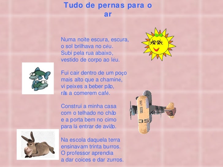 13. 14. Tudo de pernas para o ar Numa noite escura, escura, o sol brilhava no c é u. Subi pela rua abaixo, vestido de corpo ao l é u. Fui cair dentro de um po ç o mais alto que a chamin é , vi peixes a beber pão, rãs a comerem caf é . Construi a minha casa com o telhado no chão e a porta bem no cimo para l á entrar de avião. Na escola daquela terra ensinavam trinta burros. O professor aprendia a dar coices e dar zurros.