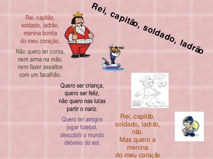 14. 16. Rei, capitão, soldado, ladrão, menina bonita do meu coração. Não quero ter coroa, nem arma na mão, nem fazer assaltos com um facalhão. . Quero ser criança, quero ser feliz, não quero nas lutas partir o nariz. Quero ter amigos jogar futebol, descobrir o mundo debaixo do sol. Rei, capitão, soldado, ladrão, não. Mas quero a menina do meu cora ç ão Rei, capitão, soldado, ladrão