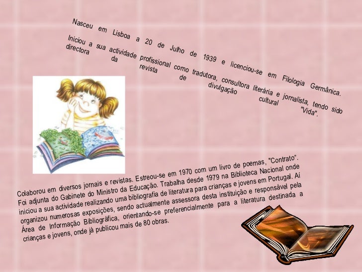 2. 2. Nasceu em Lisboa a 20 de Julho de 1939 e licenciou-se em Filologia Germânica. Iniciou a sua actividade profissional como tradutora, consultora literária e jornalista, tendo sido directora da revista de divulgação cultural "Vida". Colaborou em diversos jornais e revistas. Estreou-se em 1970 com um livro de poemas, "Contrato”. Foi adjunta do Gabinete do Ministro da Educação. Trabalha desde 1979 na Biblioteca Nacional onde iniciou a sua actividade realizando uma bibliografia de literatura para crianças e jovens em Portugal. Aí organizou numerosas exposições, sendo actualmente assessora desta instituição e responsável pela Área de Informação Bibliográfica, orientando-se preferencialmente para a literatura destinada a crianças e jovens, onde já publicou mais de 80 obras.