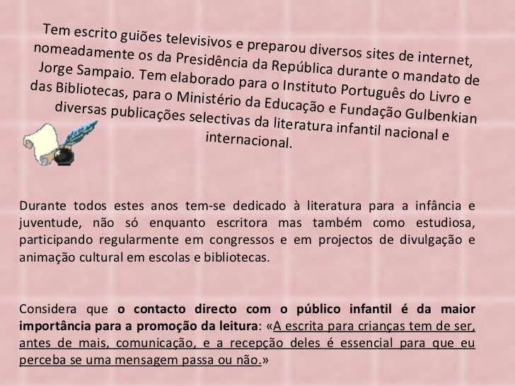4. 4. Tem escrito guiões televisivos e preparou diversos sites de internet, nomeadamente os da Presidência da República durante o mandato de Jorge Sampaio. Tem elaborado para o Instituto Português do Livro e das Bibliotecas, para o Ministério da Educação e Fundação Gulbenkian diversas publicações selectivas da literatura infantil nacional e internacional. Durante todos estes anos tem-se dedicado à literatura para a infância e juventude, não só enquanto escritora mas também como estudiosa, participando regularmente em congressos e em projectos de divulgação e animação cultural em escolas e bibliotecas. Considera que o contacto directo com o público infantil é da maior importância para a promoção da leitura : « A escrita para crianças tem de ser, antes de mais, comunicação, e a recepção deles é essencial para que eu perceba se uma mensagem passa ou não. »