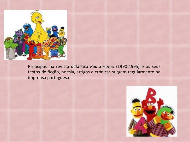 5. 5. Participou na revista didáctica Rua Sésamo (1990-1995) e os seus textos de ficção, poesia, artigos e crónicas surgem regularmente na imprensa portuguesa.