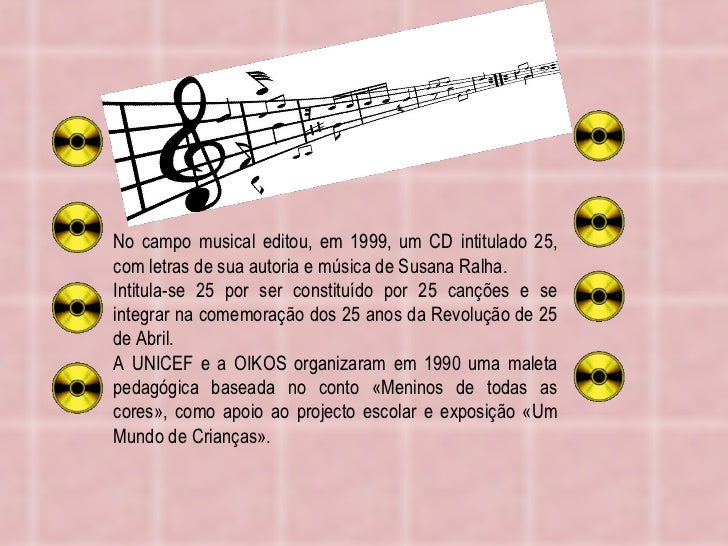 6. 6. No campo musical editou, em 1999, um CD intitulado 25, com letras de sua autoria e música de Susana Ralha. Intitula-se 25 por ser constituído por 25 canções e se integrar na comemoração dos 25 anos da Revolução de 25 de Abril. A UNICEF e a OIKOS organizaram em 1990 uma maleta pedagógica baseada no conto «Meninos de todas as cores», como apoio ao projecto escolar e exposição «Um Mundo de Crianças».