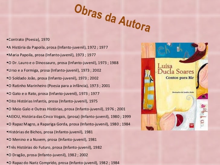 8. 8. Obras da Autora <ul><li>Contrato (Poesia), 1970 </li></ul><ul><li>A História da Papoila, prosa (Infanto-juvenil), 1972 ; 1977 </li></ul><ul><li>Maria Papoila, prosa (Infanto-juvenil), 1973 ; 1977 </li></ul><ul><li>O Dr. Lauro e o Dinossauro, prosa (Infanto-juvenil), 1973 ; 1988 </li></ul><ul><li>Urso e a Formiga, prosa (Infanto-juvenil), 1973 ; 2002 </li></ul><ul><li>O Soldado João, prosa (Infanto-juvenil), 1973 ; 2002 </li></ul><ul><li>O Ratinho Marinheiro (Poesia para a infância), 1973 ; 2001 </li></ul><ul><li>O Gato e o Rato, prosa (Infanto-juvenil), 1973 ; 1977 </li></ul><ul><li>Oito Histórias Infantis, prosa (Infanto-juvenil), 1975 </li></ul><ul><li>O Meio Galo e Outras Histórias, prosa (Infanto-juvenil), 1976 ; 2001 </li></ul><ul><li>AEIOU, História das Cinco Vogais, (prosa) (Infanto-juvenil), 1980 ; 1999 </li></ul><ul><li>O Rapaz Magro, a Rapariga Gorda, prosa (Infanto-juvenil), 1980 ; 1984 </li></ul><ul><li>Histórias de Bichos, prosa (Infanto-juvenil), 1981 </li></ul><ul><li>O Menino e a Nuvem, prosa (Infanto-juvenil), 1981 </li></ul><ul><li>Três Histórias do Futuro, prosa (Infanto-juvenil), 1982 </li></ul><ul><li>O Dragão, prosa (Infanto-juvenil), 1982 ; 2002 </li></ul><ul><li>O Rapaz do Nariz Comprido, prosa (Infanto-juvenil), 1982 ; 1984 </li></ul>