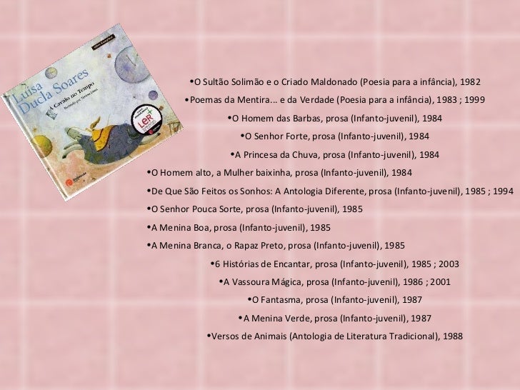 9. 9. <ul><li>O Sultão Solimão e o Criado Maldonado (Poesia para a infância), 1982 </li></ul><ul><li>Poemas da Mentira... e da Verdade (Poesia para a infância), 1983 ; 1999 </li></ul><ul><li>O Homem das Barbas, prosa (Infanto-juvenil), 1984 </li></ul><ul><li>O Senhor Forte, prosa (Infanto-juvenil), 1984 </li></ul><ul><li>A Princesa da Chuva, prosa (Infanto-juvenil), 1984 </li></ul><ul><li>O Homem alto, a Mulher baixinha, prosa (Infanto-juvenil), 1984 </li></ul><ul><li>De Que São Feitos os Sonhos: A Antologia Diferente, prosa (Infanto-juvenil), 1985 ; 1994 </li></ul><ul><li>O Senhor Pouca Sorte, prosa (Infanto-juvenil), 1985 </li></ul><ul><li>A Menina Boa, prosa (Infanto-juvenil), 1985 </li></ul><ul><li>A Menina Branca, o Rapaz Preto, prosa (Infanto-juvenil), 1985 </li></ul><ul><li>6 Histórias de Encantar, prosa (Infanto-juvenil), 1985 ; 2003 </li></ul><ul><li>A Vassoura Mágica, prosa (Infanto-juvenil), 1986 ; 2001 </li></ul><ul><li>O Fantasma, prosa (Infanto-juvenil), 1987 </li></ul><ul><li>A Menina Verde, prosa (Infanto-juvenil), 1987 </li></ul><ul><li>Versos de Animais (Antologia de Literatura Tradicional), 1988 </li></ul>