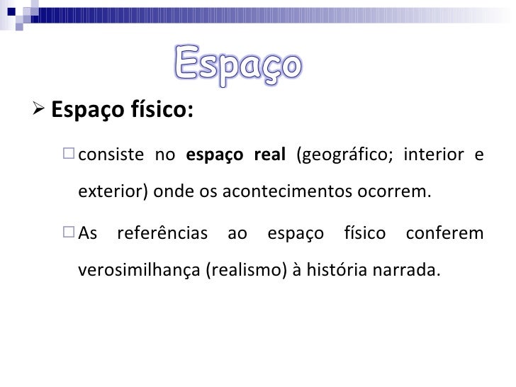 10. 10. <ul><li>Espaço físico: </li></ul><ul><ul><li>consiste no espaço real (geográfico; interior e exterior) onde os acontecimentos ocorrem. </li></ul></ul><ul><ul><li>As referências ao espaço físico conferem verosimilhança (realismo) à história narrada. </li></ul></ul>