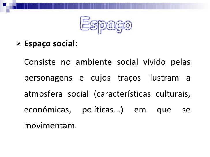 <ul><li>Espaço social:  </li></ul><ul><li>Consiste no  ambiente social  vivido pelas personagens e cujos traços ilustram a...