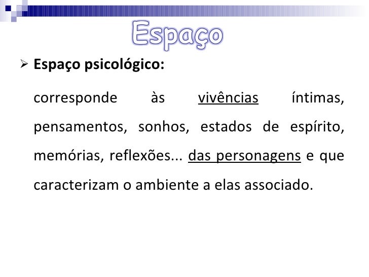 12. 12. <ul><li>Espaço psicológico: </li></ul><ul><li>corresponde às vivências íntimas, pensamentos, sonhos, estados de espírito, memórias, reflexões... das personagens e que caracterizam o ambiente a elas associado. </li></ul>