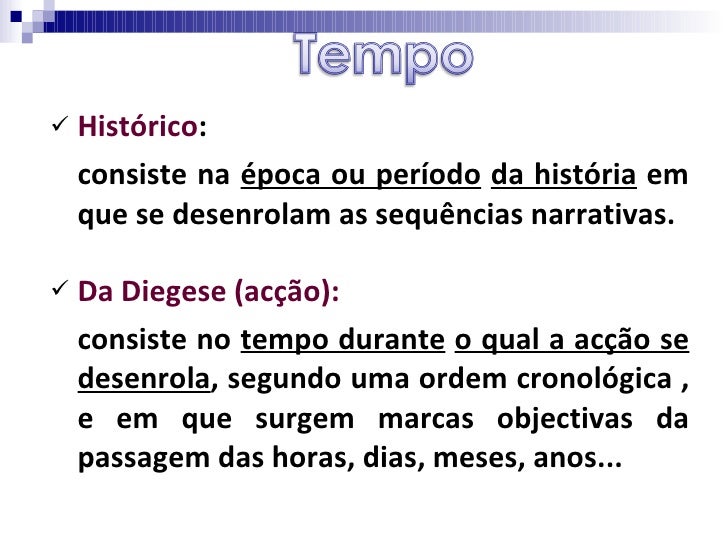 14. 14. <ul><li>Histórico : </li></ul><ul><li>consiste na época ou período da história em que se desenrolam as sequências narrativas. </li></ul><ul><li>Da Diegese (acção): </li></ul><ul><li>consiste no tempo durante o qual a acção se desenrola , segundo uma ordem cronológica , e em que surgem marcas objectivas da passagem das horas, dias, meses, anos... </li></ul>