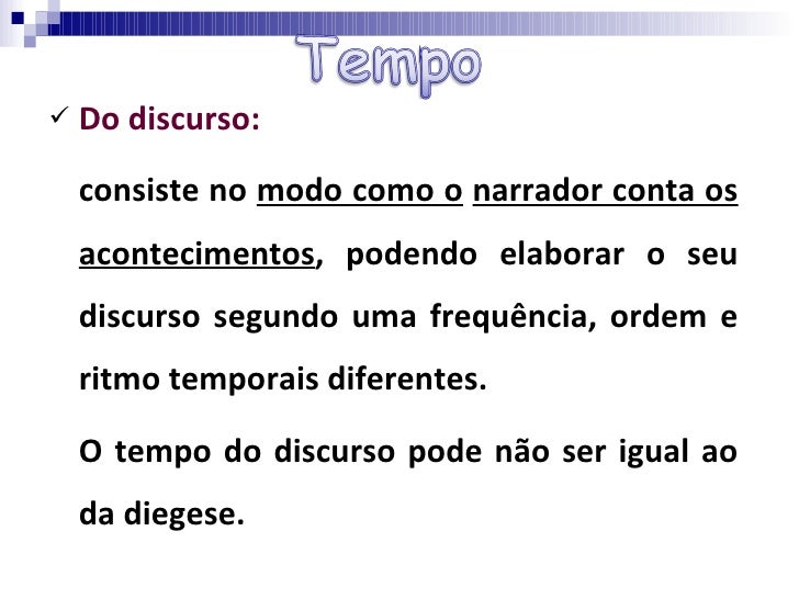 15. 15. <ul><li>Do discurso: </li></ul><ul><li>consiste no modo como o narrador conta os acontecimentos , podendo elaborar o seu discurso segundo uma frequência, ordem e ritmo temporais diferentes. </li></ul><ul><li>O tempo do discurso pode não ser igual ao da diegese. </li></ul>