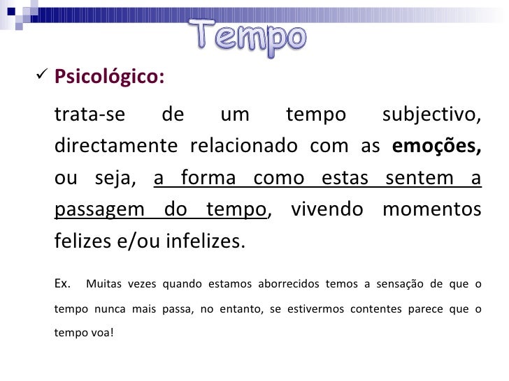 <ul><li>Psicológico:  </li></ul><ul><li>trata-se de um tempo subjectivo, directamente relacionado com as  emoções,  ou sej...