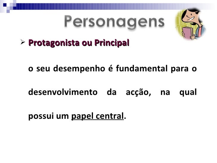 19. 19. <ul><li>Protagonista ou Principal </li></ul><ul><li>o seu desempenho é fundamental para o desenvolvimento da acção, na qual possui um papel central . </li></ul>