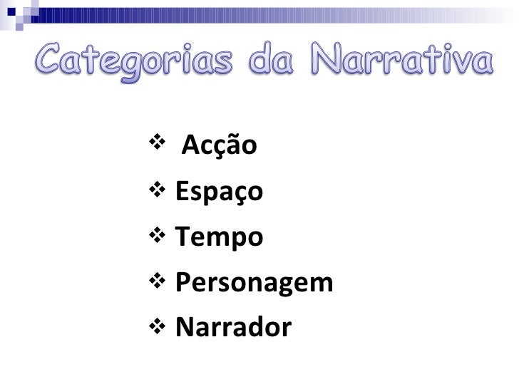 <ul><li>Acção </li></ul><ul><li>Espaço </li></ul><ul><li>Tempo </li></ul><ul><li>Personagem </li></ul><ul><li>Narrador </l...