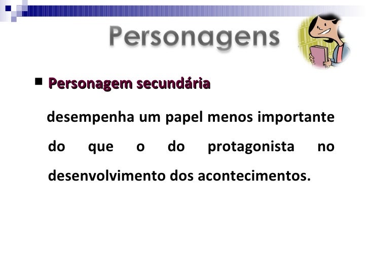 20. 20. <ul><li>Personagem secundária </li></ul><ul><li>desempenha um papel menos importante do que o do protagonista no desenvolvimento dos acontecimentos. </li></ul>