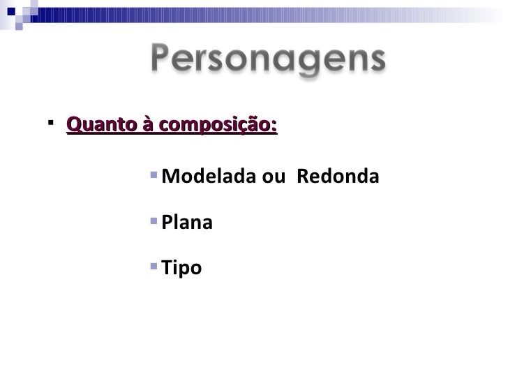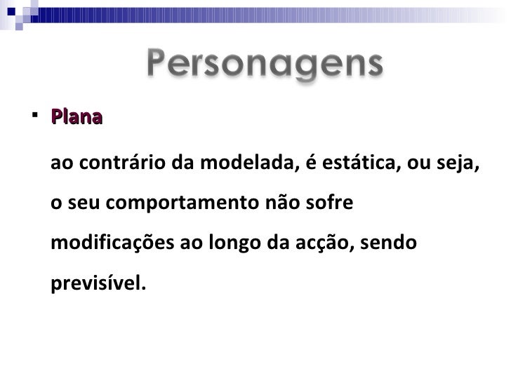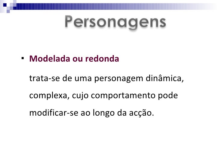 <ul><li>Modelada ou redonda   </li></ul><ul><li>trata-se de uma personagem dinâmica, complexa, cujo comportamento pode mod...