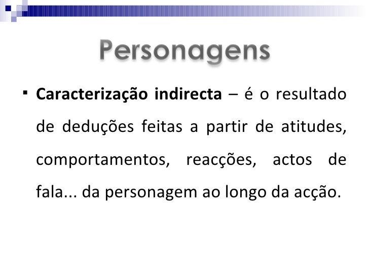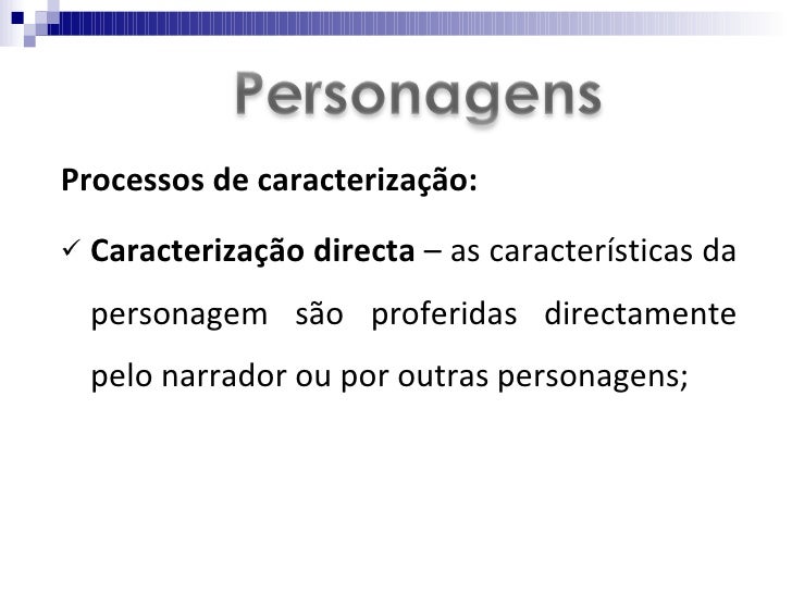 <ul><li>Processos de caracterização:  </li></ul><ul><li>Caracterização directa  – as características da personagem são pro...