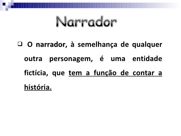 <ul><li>O  narrador , à semelhança de qualquer outra personagem, é uma entidade fictícia, que  tem a função de contar a hi...
