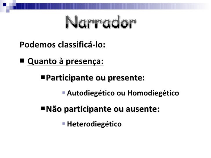 29. 29. <ul><li>Podemos classificá-lo: </li></ul><ul><li>Quanto à presença: </li></ul><ul><ul><ul><li>Participante ou presente : </li></ul></ul></ul><ul><ul><ul><ul><ul><li>Autodiegético ou Homodiegético </li></ul></ul></ul></ul></ul><ul><ul><ul><li>Não participante ou ausente: </li></ul></ul></ul><ul><ul><ul><ul><ul><li>Heterodiegético </li></ul></ul></ul></ul></ul>