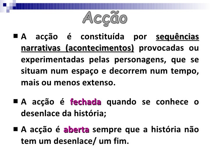3. 3. <ul><li>A acção é constituída por sequências narrativas (acontecimentos) provocadas ou experimentadas pelas personagens, que se situam num espaço e decorrem num tempo, mais ou menos extenso. </li></ul><ul><li>A acção é fechada quando se conhece o desenlace da história; </li></ul><ul><li>A acção é aberta sempre que a história não tem um desenlace/ um fim. </li></ul>