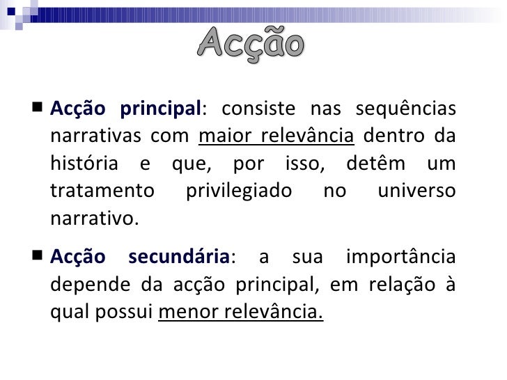 4. 4. <ul><li>Acção principal : consiste nas sequências narrativas com maior relevância dentro da história e que, por isso, detêm um tratamento privilegiado no universo narrativo. </li></ul><ul><li>Acção secundária : a sua importância depende da acção principal, em relação à qual possui menor relevância. </li></ul>