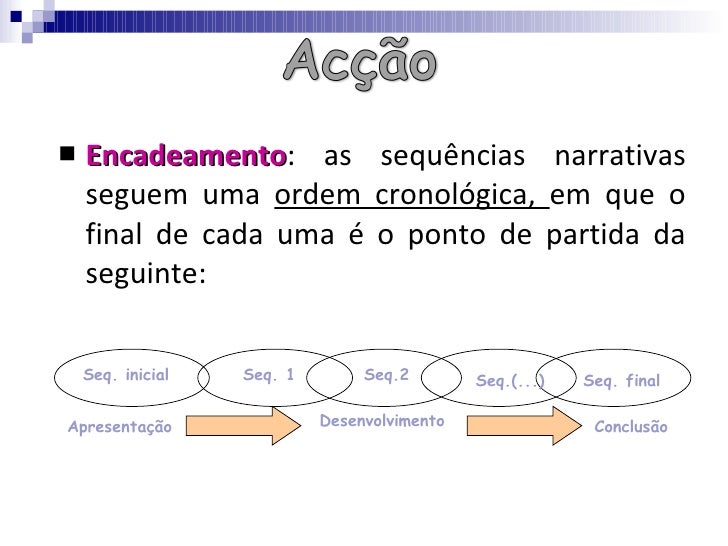 <ul><li>Encadeamento : as sequências narrativas seguem uma  ordem cronológica,  em que o final de cada uma é o ponto de pa...