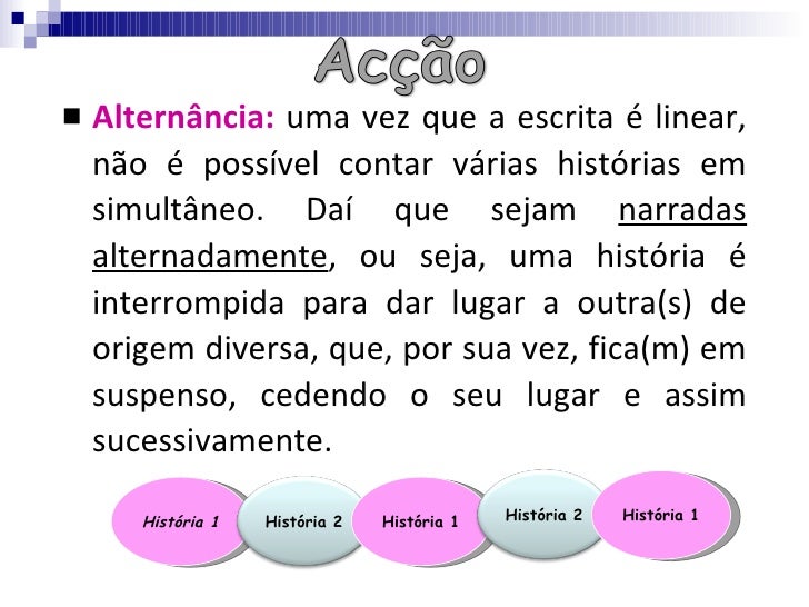 <ul><li>Alternância:  uma vez que a escrita é linear, não é possível contar várias histórias em simultâneo. Daí que sejam ...