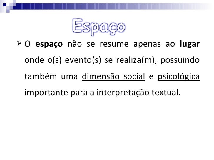 9. 9. <ul><li>O espaço não se resume apenas ao lugar onde o(s) evento(s) se realiza(m), possuindo também uma dimensão social e psicológica importante para a interpretação textual. </li></ul>