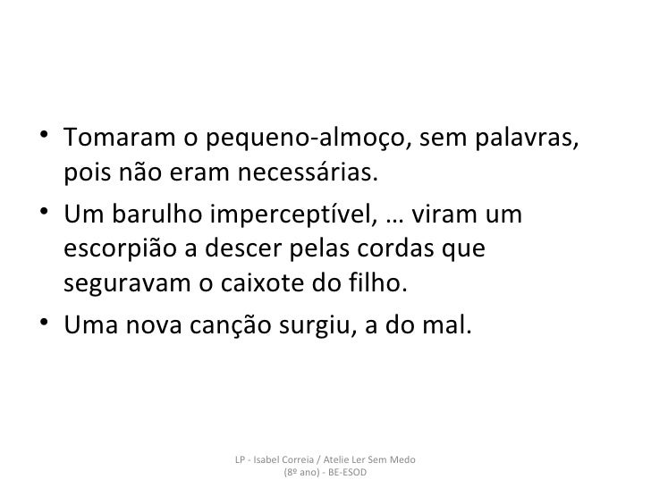 10. 10. <ul><li>Tomaram o pequeno-almoço, sem palavras, pois não eram necessárias. </li></ul><ul><li>Um barulho imperceptível, … viram um escorpião a descer pelas cordas que seguravam o caixote do filho. </li></ul><ul><li>Uma nova canção surgiu, a do mal. </li></ul>LP - Isabel Correia / Atelie Ler Sem Medo (8º ano) - BE-ESOD