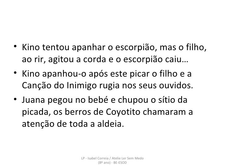 11. 11. <ul><li>Kino tentou apanhar o escorpião, mas o filho, ao rir, agitou a corda e o escorpião caiu… </li></ul><ul><li>Kino apanhou-o após este picar o filho e a Canção do Inimigo rugia nos seus ouvidos. </li></ul><ul><li>Juana pegou no bebé e chupou o sítio da picada, os berros de Coyotito chamaram a atenção de toda a aldeia. </li></ul>LP - Isabel Correia / Atelie Ler Sem Medo (8º ano) - BE-ESOD