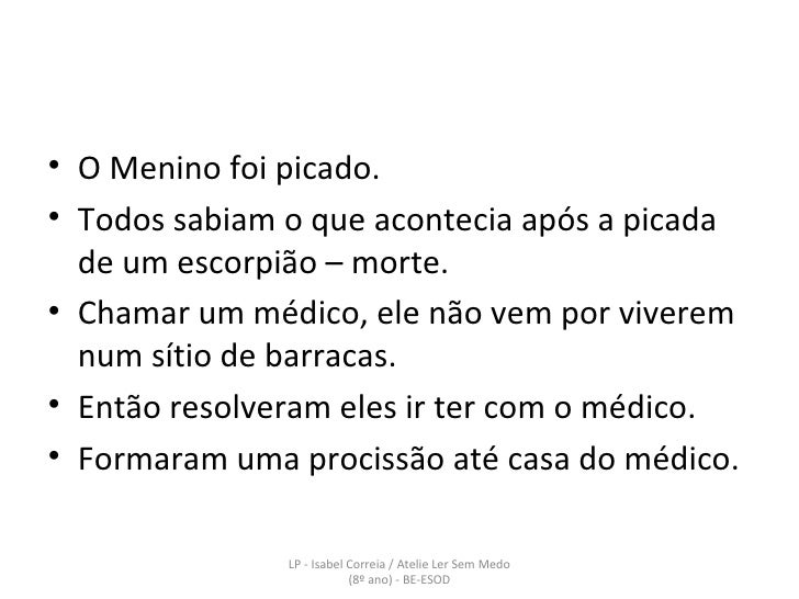 12. 12. <ul><li>O Menino foi picado. </li></ul><ul><li>Todos sabiam o que acontecia após a picada de um escorpião – morte. </li></ul><ul><li>Chamar um médico, ele não vem por viverem num sítio de barracas. </li></ul><ul><li>Então resolveram eles ir ter com o médico. </li></ul><ul><li>Formaram uma procissão até casa do médico. </li></ul>LP - Isabel Correia / Atelie Ler Sem Medo (8º ano) - BE-ESOD