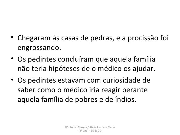 13. 13. <ul><li>Chegaram às casas de pedras, e a procissão foi engrossando. </li></ul><ul><li>Os pedintes concluíram que aquela família não teria hipóteses de o médico os ajudar. </li></ul><ul><li>Os pedintes estavam com curiosidade de saber como o médico iria reagir perante aquela família de pobres e de índios. </li></ul>LP - Isabel Correia / Atelie Ler Sem Medo (8º ano) - BE-ESOD