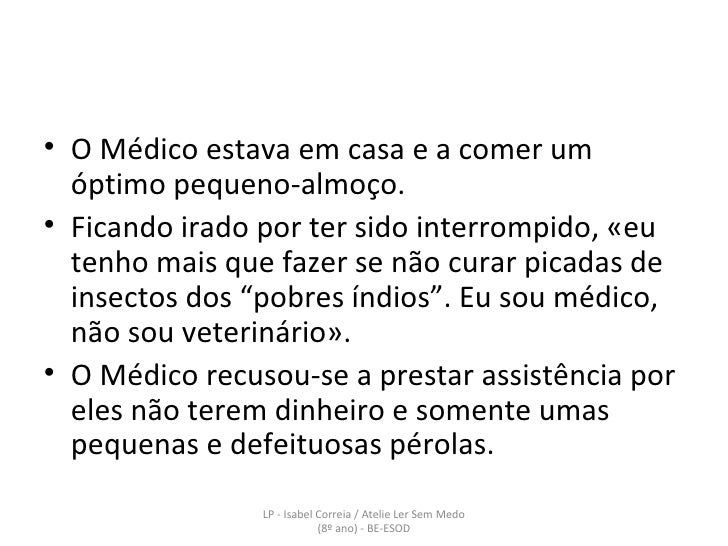 14. 14. <ul><li>O Médico estava em casa e a comer um óptimo pequeno-almoço. </li></ul><ul><li>Ficando irado por ter sido interrompido, «eu tenho mais que fazer se não curar picadas de insectos dos “pobres índios”. Eu sou médico, não sou veterinário». </li></ul><ul><li>O Médico recusou-se a prestar assistência por eles não terem dinheiro e somente umas pequenas e defeituosas pérolas. </li></ul>LP - Isabel Correia / Atelie Ler Sem Medo (8º ano) - BE-ESOD