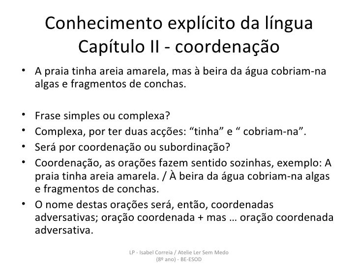 15. 15. Conhecimento explícito da língua Capítulo II - coordenação <ul><li>A praia tinha areia amarela, mas à beira da água cobriam-na algas e fragmentos de conchas. </li></ul><ul><li>Frase simples ou complexa? </li></ul><ul><li>Complexa, por ter duas acções: “tinha” e “ cobriam-na”. </li></ul><ul><li>Será por coordenação ou subordinação? </li></ul><ul><li>Coordenação, as orações fazem sentido sozinhas, exemplo: A praia tinha areia amarela. / À beira da água cobriam-na algas e fragmentos de conchas. </li></ul><ul><li>O nome destas orações será, então, coordenadas adversativas; oração coordenada + mas … oração coordenada adversativa. </li></ul>LP - Isabel Correia / Atelie Ler Sem Medo (8º ano) - BE-ESOD