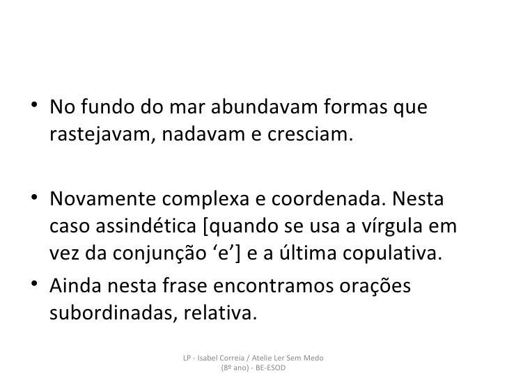 16. 16. <ul><li>No fundo do mar abundavam formas que rastejavam, nadavam e cresciam. </li></ul><ul><li>Novamente complexa e coordenada. Nesta caso assindética [quando se usa a vírgula em vez da conjunção ‘e’] e a última copulativa. </li></ul><ul><li>Ainda nesta frase encontramos orações subordinadas, relativa. </li></ul>LP - Isabel Correia / Atelie Ler Sem Medo (8º ano) - BE-ESOD