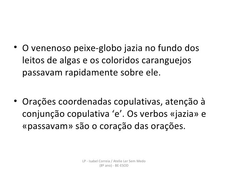 17. 17. <ul><li>O venenoso peixe-globo jazia no fundo dos leitos de algas e os coloridos caranguejos passavam rapidamente sobre ele. </li></ul><ul><li>Orações coordenadas copulativas, atenção à conjunção copulativa ‘e’. Os verbos «jazia» e «passavam» são o coração das orações. </li></ul>LP - Isabel Correia / Atelie Ler Sem Medo (8º ano) - BE-ESOD