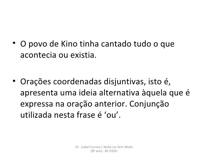 18. 18. <ul><li>O povo de Kino tinha cantado tudo o que acontecia ou existia. </li></ul><ul><li>Orações coordenadas disjuntivas, isto é, apresenta uma ideia alternativa àquela que é expressa na oração anterior. Conjunção utilizada nesta frase é ‘ou’. </li></ul>LP - Isabel Correia / Atelie Ler Sem Medo (8º ano) - BE-ESOD