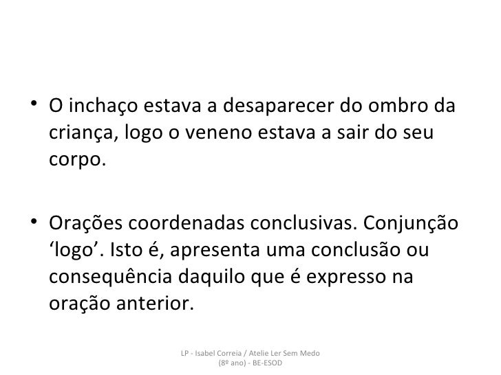 19. 19. <ul><li>O inchaço estava a desaparecer do ombro da criança, logo o veneno estava a sair do seu corpo. </li></ul><ul><li>Orações coordenadas conclusivas. Conjunção ‘logo’. Isto é, apresenta uma conclusão ou consequência daquilo que é expresso na oração anterior. </li></ul>LP - Isabel Correia / Atelie Ler Sem Medo (8º ano) - BE-ESOD