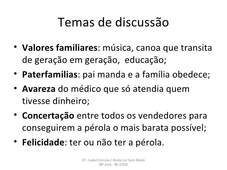 2. 2. Temas de discussão <ul><li>Valores familiares : música, canoa que transita de geração em geração, educação; </li></ul><ul><li>Paterfamilias : pai manda e a família obedece; </li></ul><ul><li>Avareza do médico que só atendia quem tivesse dinheiro; </li></ul><ul><li>Concertação entre todos os vendedores para conseguirem a pérola o mais barata possível; </li></ul><ul><li>Felicidade : ter ou não ter a pérola. </li></ul>LP - Isabel Correia / Atelie Ler Sem Medo (8º ano) - BE-ESOD